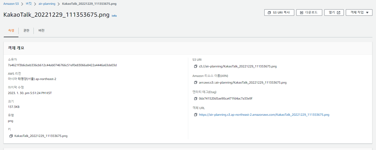 위의 속성 페이지에서 객체 URL에 접속하여 등록한 이미지의 파일이 잘 뜨는지 확인한다.