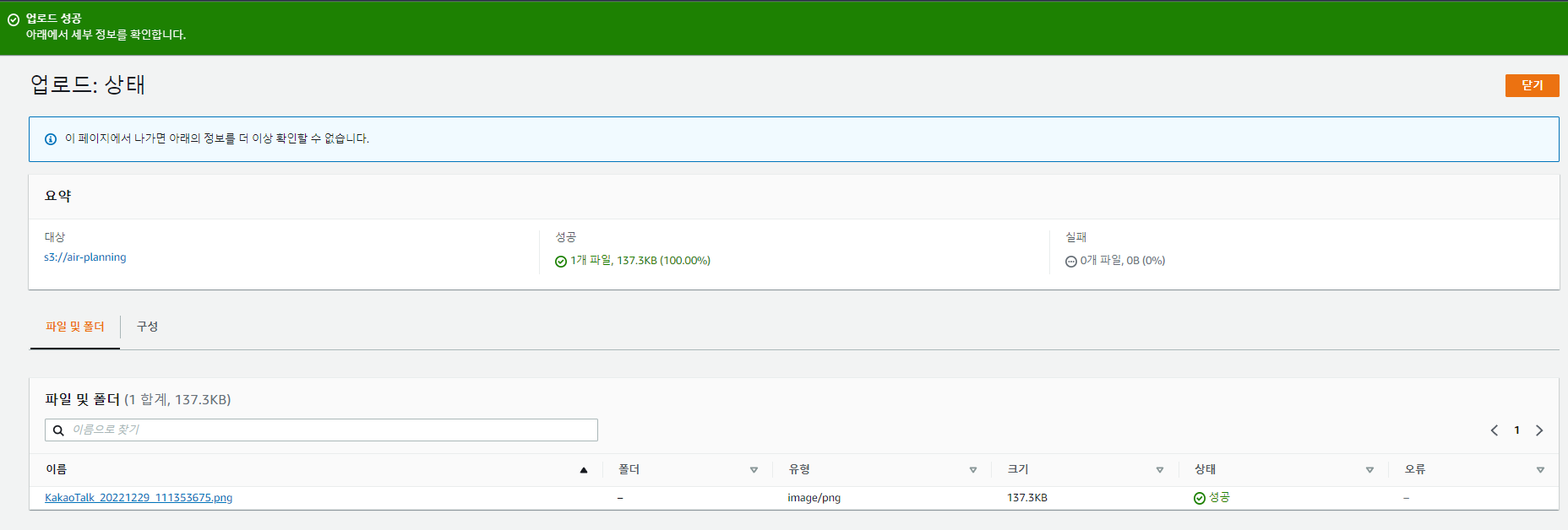 성공했다면, 아래의 업로드한 파일 이름을 클릭한다.