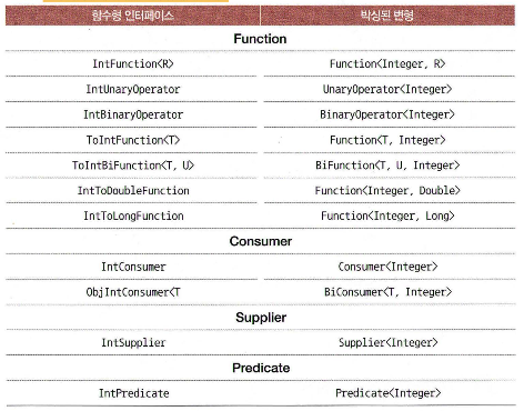 아래는 원시타입 중 하나인 int 타입의 인수를 받을 수 있는 특수한 함수형 인터페이스들이다.
